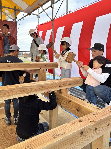 メインイベントの、子どもさん達と大工で作る子ども上棟式や、メンテナンスのノウハウが学べる家守りブース、職人さんが手掛ける子どもさん向けのいっぱい当たる射的、みんな当たるお楽しみくじ引き、カンナを使ったヒノキの箸づくり、端材を選んでアニマル作り、大工さんとカンナ体験、色んなマルシェにキッチンカーなどなど、色々な催しがありました。