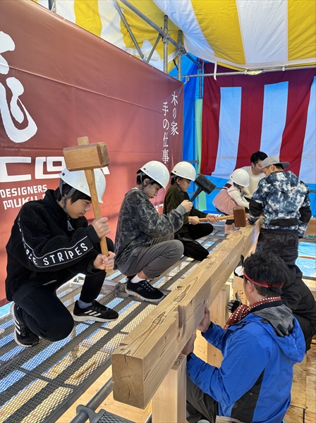 「かけや」という木製のハンマーで木材を組んでいきます。