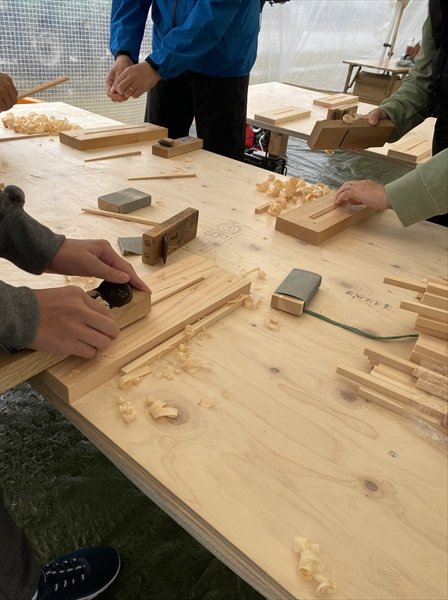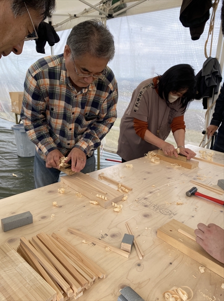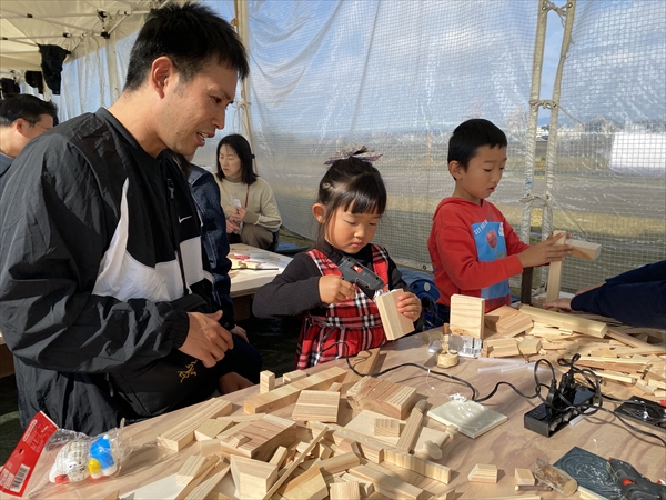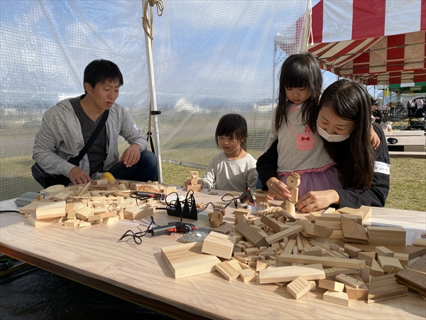 「ヒノキの箸づくり」は、カンナでマイ箸づくりに加えて、箸袋・箸置きのプレゼントがあり、「端材アニマル作り」は、動物や車を子どもさんと親さんと共同作業で作り上げることを楽しんでいただけて、大変人気なブースになりました。