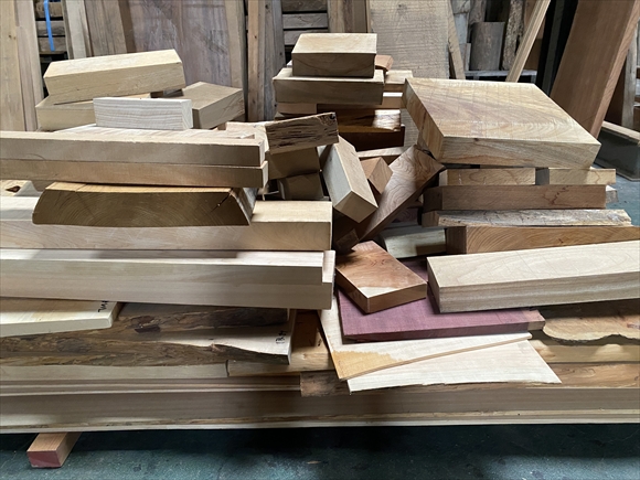 今回も、一枚板はもちろんですが、細かい端材や珍しい木材を集めました。